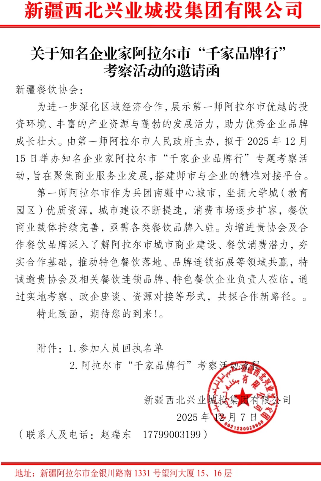 “千家品牌行”专题考察活动将于2025年12月15日至17日在新疆生产建设兵团**师阿拉尔市隆重举行。期待您的莅临,携手共拓西部新机遇,共绘产业新蓝图!