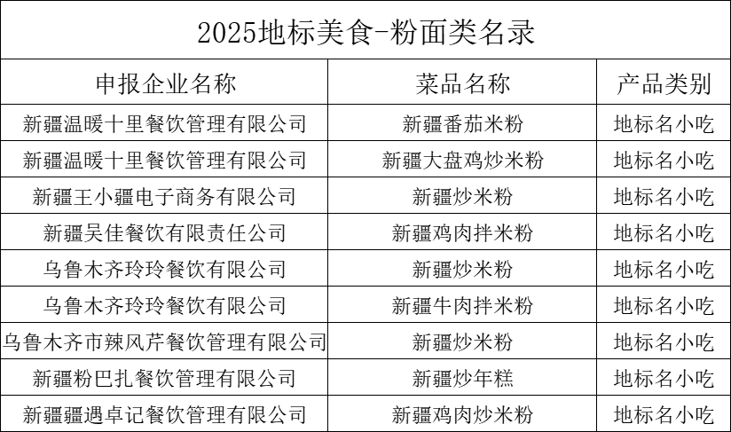2025CHA中国美食烹饪锦标赛-米粉烹饪大赛中,新疆米粉口味独特,赢得大赛评委们的一致好评,新疆温暖十里餐饮管理有限公司的新疆番茄米粉、新疆大盘鸡炒米粉,新疆王小疆电子商务有限公司的新疆炒米粉,新疆吴佳餐饮有限责任公司的新疆鸡肉拌米粉,乌鲁木齐玲玲餐饮有限公司的新疆炒米粉、新疆牛肉拌米粉,乌鲁木齐市辣风芹餐饮管理有限公司的新疆炒米粉,新疆粉巴扎餐饮管理有限公司的新疆炒年糕,新疆疆遇卓记餐饮管理有限公司的新疆鸡肉炒米粉在“2025地标美食-粉面类名录”荣登榜首。
