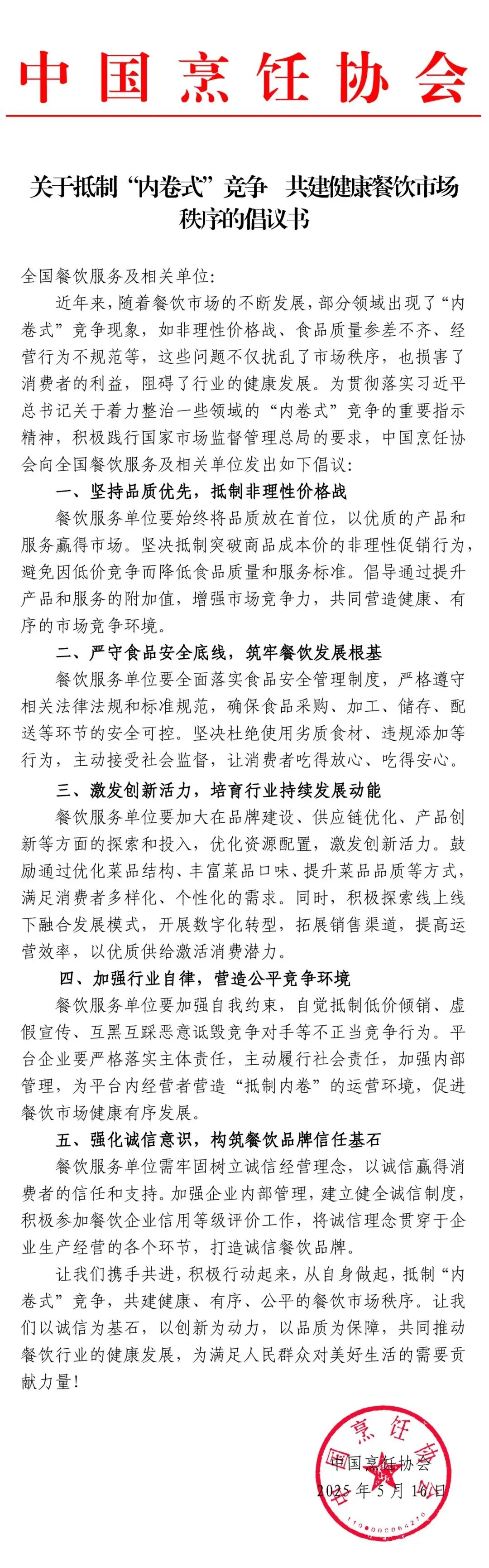 首页政策法规与标准关于抵制“内卷式”竞争 共建健康餐饮市场秩序的倡议书